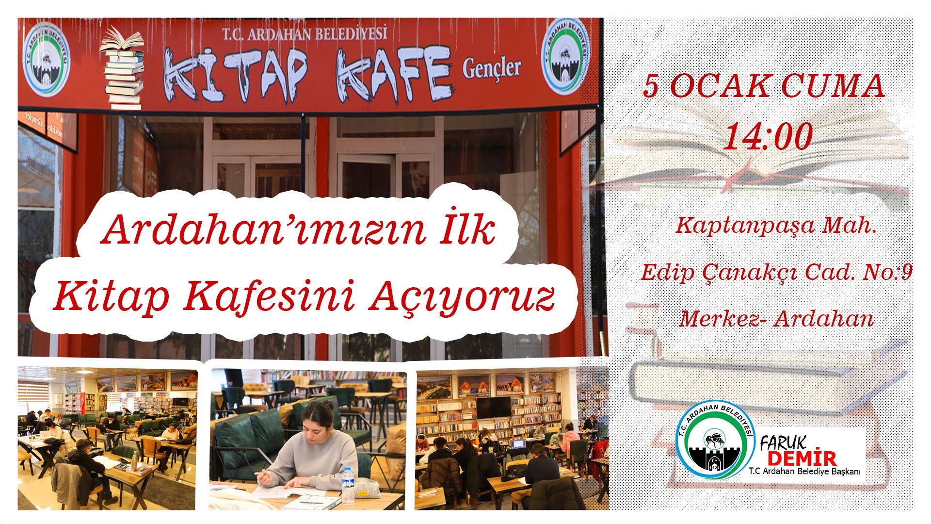 Ardahan Belediyesi sosyal sorumluluk projesi kapsamında Kitap Kafe, 05 01. 2024 Ocak Cuma Günü saat 14.00’da Kaptanpaşa Mahallesi Edip Çanakçı Caddesi No 9 düzenlenecek açılış töreni ile hizmete açılacak. Tüm halkımız davetlidir.