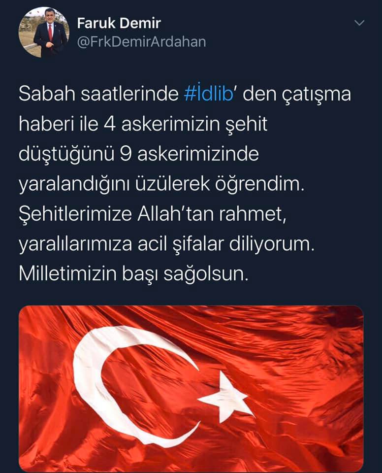 Sabah saatlerinde #İdlib’ den çatışma haberi ile 4 askerimizin şehit düştüğünü 9 askerimizinde yaralandığını üzülerek öğrendim. Şehitlerimize Allah’tan rahmet, yaralılarımıza acil şifalar diliyorum. Milletimizin başı sağ olsun.