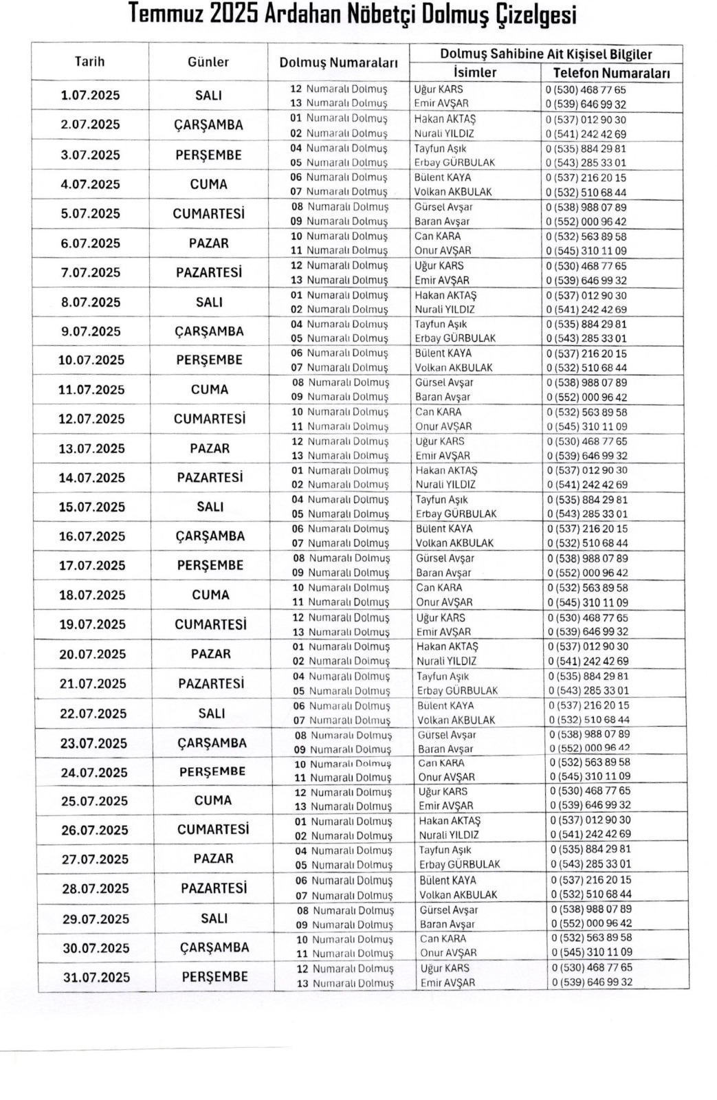 Şehir içi dolmuşların çalışma düzen ve saatine uymadıkları yönünde gerek vatandaşların sözlü beyanı gerekse CİMER üzerinden gelen yazılı şikâyetleri değerlendirmek üzere yapılan durum değerlendirme toplantısı sonucunda alınan karar gereği; Bundan böyle Şoförler Odası tarafından hafta içi ve hafta sonu olmak üzere hazırlanacak olan aylık dolmuş nöbet listeleri Zabıta Müdürlüğü ekiplerince dolmuş duraklarına asılacaktır. Söz konusu karara aykırı davranan, kurallara uymayan dolmuşçular hakkında yasal işlem başlatılacaktır. Zabıta ekiplerinin yapacakları uyarılara 3.defa kayıtsız kalan dolmuş sahipleri için emre itaatsizlikten dolayı 1 ay trafikten men cezası verilecektir.